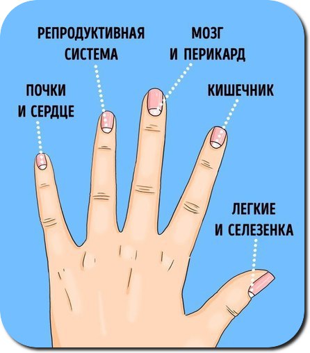 13 проблем со здоровьем, о которых предупреждают лунки на ногтяхИзменения лунки на одном пальце• Лунула (это видимая часть ногтевого корня) на мизинце, как правило, должна быть практически незаметна или вовсе отсутствовать. Связана она с работой почек, тонкого кишечника и сердца. Увеличенная лунка может быть причиной повышенного кровяного давления.Показать полностью…• Безымянный палец отвечает за работу репродуктивной и лимфатической систем. Плохо заметная лунка может говорить о проблемах с обменом веществ.• Средний палец связан с работой головного мозга и сердечно-сосудистой системы. Отсутствие лунки может указывать на проблемы с сосудами и повышенное давление.• Лунка на указательном пальце может отсутствовать или сильно уменьшиться из-за неправильной работы кишечника, поджелудочной железы или хронических заболеваний ЛОР-органов.• Лунула на большом пальце отображает работу легких и селезенки. Она самая заметная из всех и должна быть размером не больше 25 % от длины всего ногтя. Может сильно уменьшиться у постоянных курильщиков или увеличиться при повышенном артериальном давлении.Слишком большие лункиЛунулы считаются большими, когда занимают треть (или больше) всего ногтя. Они указывают на проблемы с сердечно-сосудистой системой, сбои сердечного ритма и пониженное артериальное давление.Часто большие лунки можно наблюдать у спортсменов и людей, чей род деятельности связан с физическими нагрузками. Если человек не занимается спортом, то увеличенные лунки могут появиться из-за сильного стресса.Маленькие лункиМаленькие лунки, которые едва достают до поверхности кутикулы, говорят о низком кровяном давлении и проблемах с кровообращением. Это может быть признаком слабой иммунной системы, плохого обмена веществ, недостатка железа и витамина В12 в организме.Если заметно, что лунулы изолированы поперечной полосой от остальной части ногтевой пластины, то это указывает на проблемы с сахаром в крови и возможное развитие сахарного диабета.Совсем не видно лунокНе стоит паниковать, если вы вовсе не обнаружили лунок на своих ногтях или ногтях ребенка. У детей они часто не видны и появляются со временем. А у некоторых людей они не появляются из-за физиологической особенности строения ногтя.Однако резкое исчезновение лунул воспринимается современной медициной как один из симптомов нарушения кровообращения. Исследование показало, что отсутствие лунул связано с проблемами с щитовидной железой, дефицитом витамина В12 и железа.Изменение цвета лунок1. Серые лунки указывают на сильную усталость, проблемы с пищеварением и возможные трудности в усвоении организмом питательных веществ.2. Белый цвет лунул — это хороший и естественный цвет. Лунки должны быть на несколько оттенков светлее кожи.3. Фиолетовый цвет — признак плохой циркуляции крови и недостатка кислорода в органах и тканях. Часто могут возникать головокружение и головные боли.4. Розовые (красные) лунки могут указывать на низкую физическую активность и проблемы с легкими.5. Черные лунки —крайне опасный признак, встречаются нечасто. Как правило, это симптом отравления тяжелыми металлами. Самый крупный и содержательный ресурс о йоге. Жми...